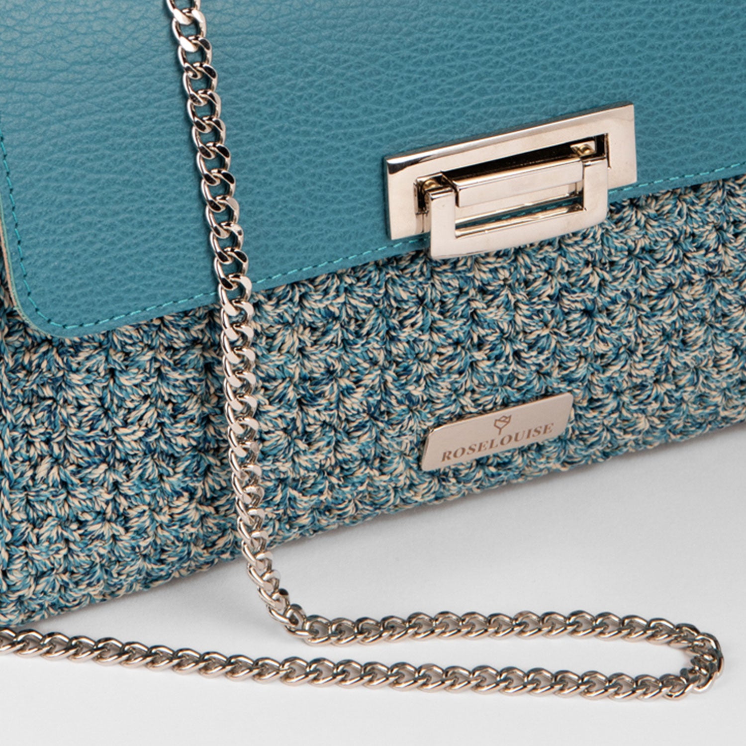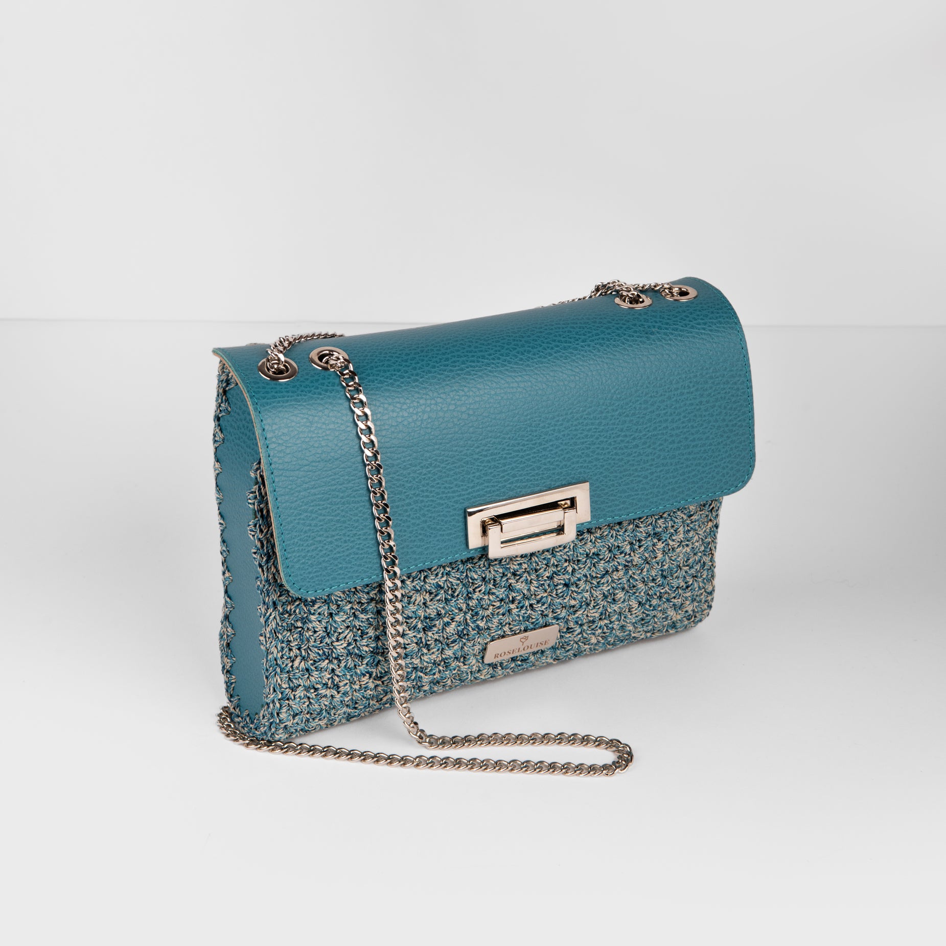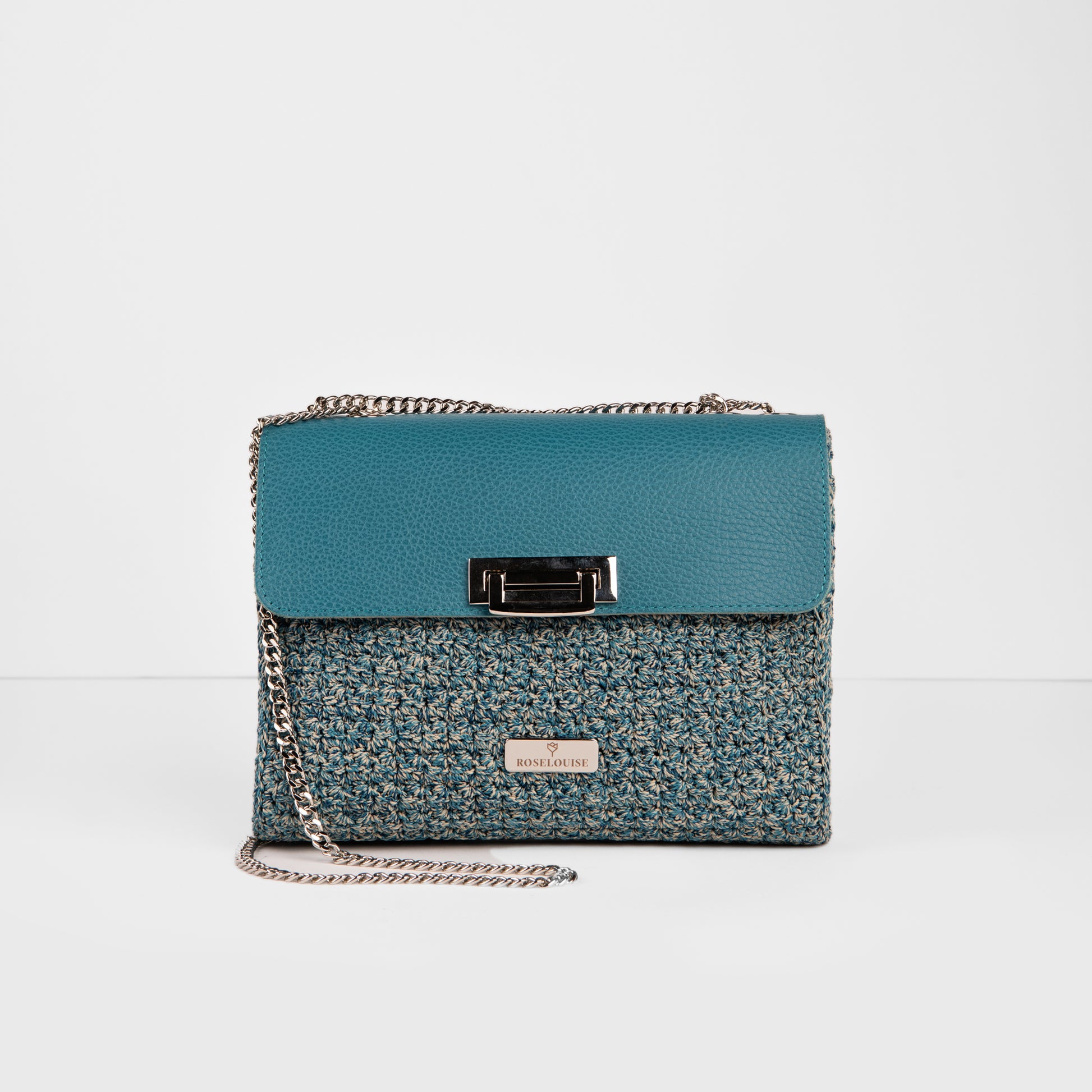 Eleganza senza tempo e un tocco di originalità si fondono in questa straordinaria borsa a spalla. Realizzata in una combinazione di vera pelle e cordino italiano 100% Polipropilene, questa borsa è un vero e proprio gioiello di artigianato. Il colore verde acqua, intenso e vibrante, la rende un accessorio perfetto per chi ama distinguersi. La tracolla in catena metallica aggiunge un tocco di modernità, mentre la chiusura con fibbia garantisce sicurezza e praticità. Perfetta per completare i tuoi look più sofisticati, sia di giorno che di sera.