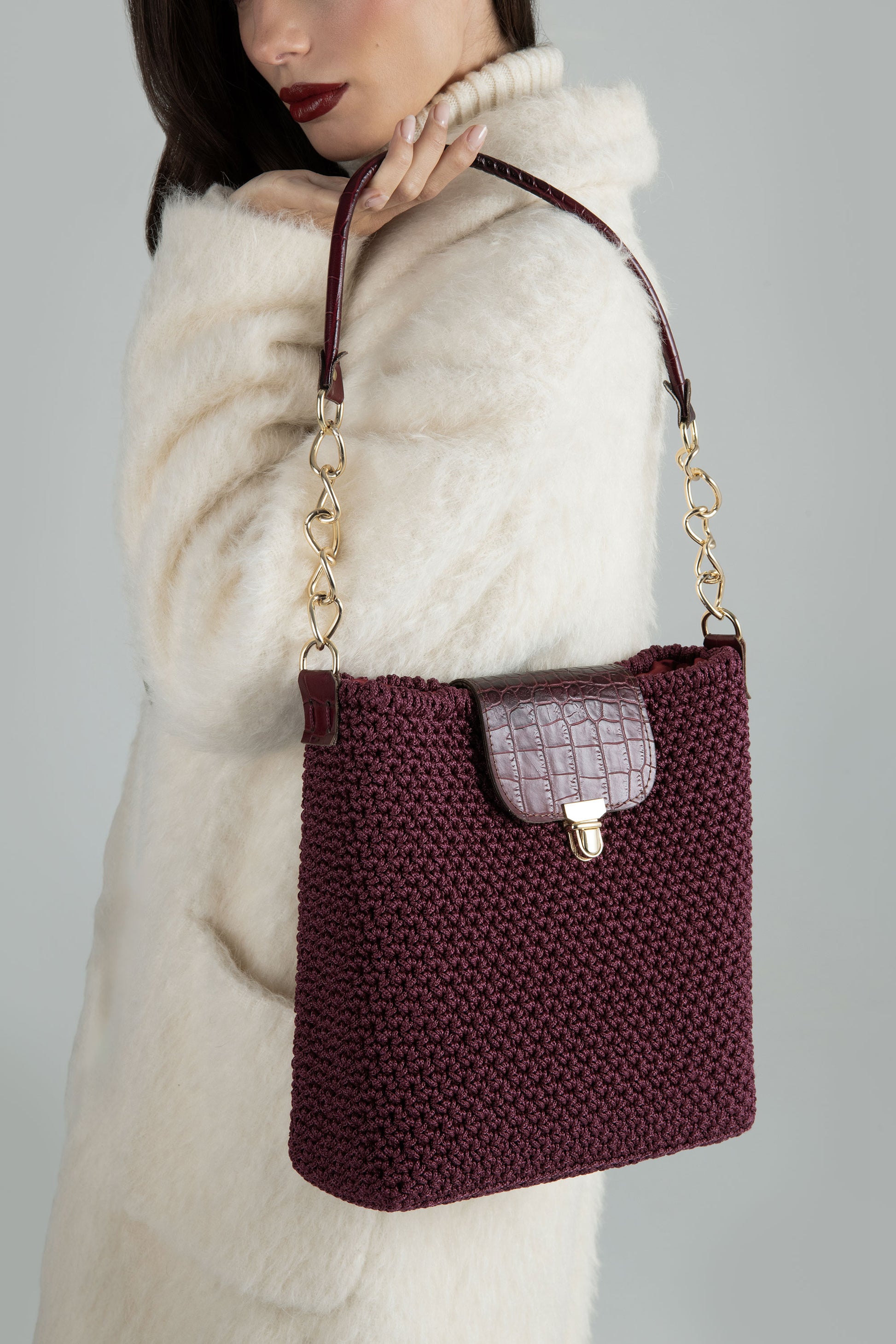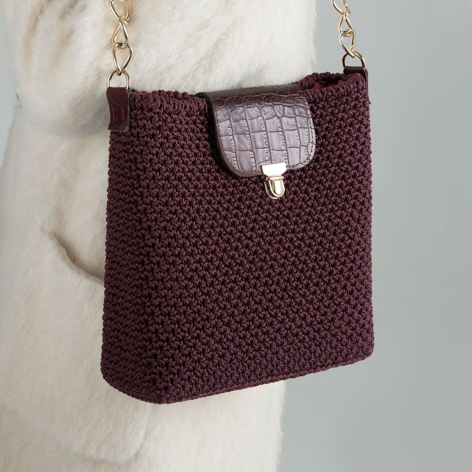 Una Tote Bag all'uncinetto con patellina centrale e monomanico in pelle è un accessorio pratico e stiloso che combina la leggerezza del crochet con la resistenza della pelle. Il corpo della borsa è realizzato completamente all'uncinetto, spesso con una trama fitta e regolare che conferisce robustezza e una texture morbida al tatto.